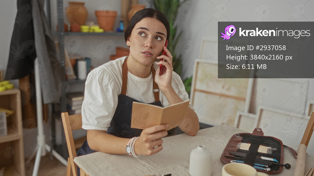 Woman in apron holds notebook and phone to ear with hand turning page in studio; contemplative calm.