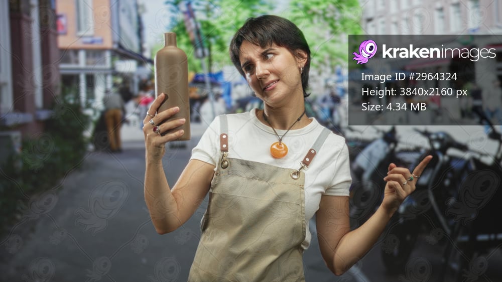 Woman in apron holds pottery bottle in right bare hand and points finger while inspecting the ceramic on a busy street market; curiosity craft evaluation. - Kraken Images