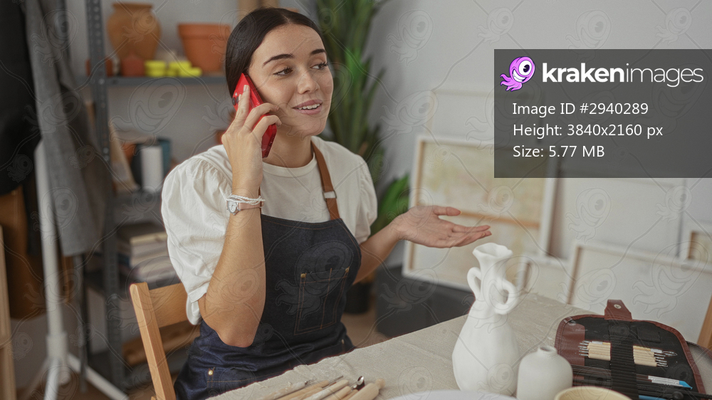 Woman in apron holds red phone to ear and gestures with open hand, seated at work table with ceramic vases and sculpting tools in pottery studio; cheerful conversation. - Kraken Images