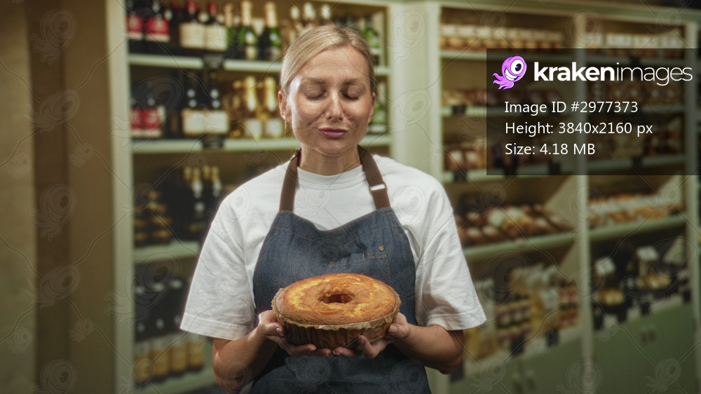 Woman in apron holds sponge cake with both hands in building bakery display of jars and loaves; homemade warmth.
