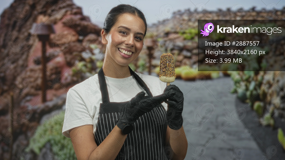 Woman in apron holds sprinkled ice cream bar on a stick in studio, smiling with gloved hand; homemade dessert joy.