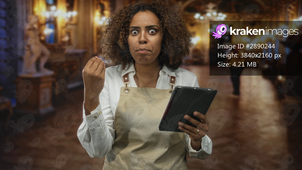Woman in apron holds tablet and makes pinched fingers gesture while speaking in ornate museum building; surprise focus.