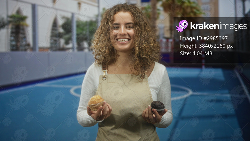 Woman in apron holds two muffins in hands, smiling and comparing pastries on an outdoor sports court in a building; home baking joy.