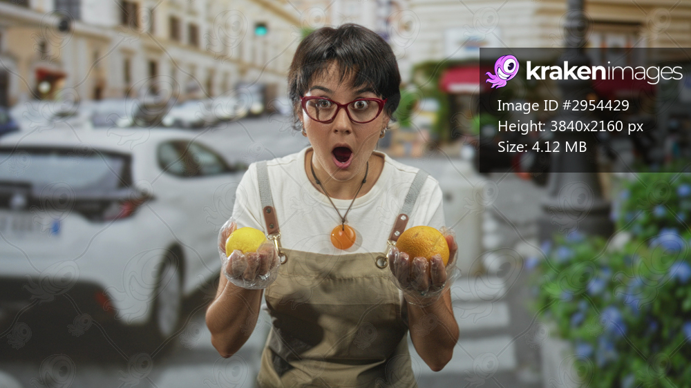 Woman in apron holds two oranges with gloved hands, mouth open in a surprised gasp on a city street near a cafe and parked cars; surprise.