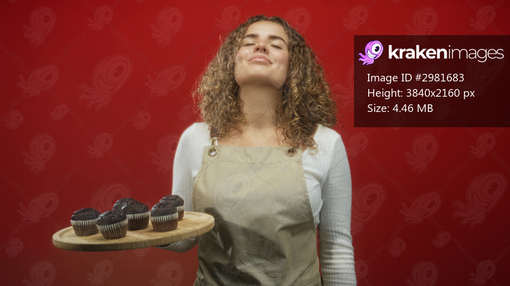 Woman in apron holds wooden board of chocolate muffins with chin tilted up and eyes closed in a studio; contentment.