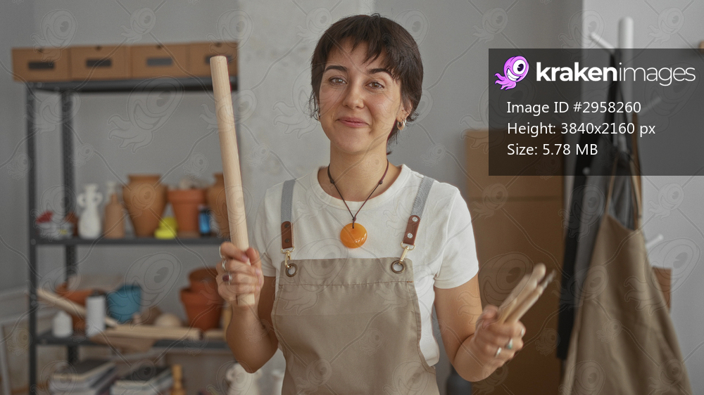 Woman in apron holds wooden dowel and pottery tools with hands, smiling and presenting them in studio; creative joy.