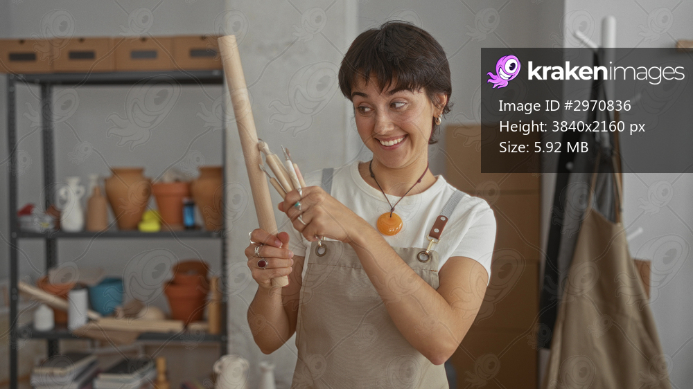 Woman in apron holds wooden dowel and pottery tools with hands, smiling and presenting them in studio; creative joy.