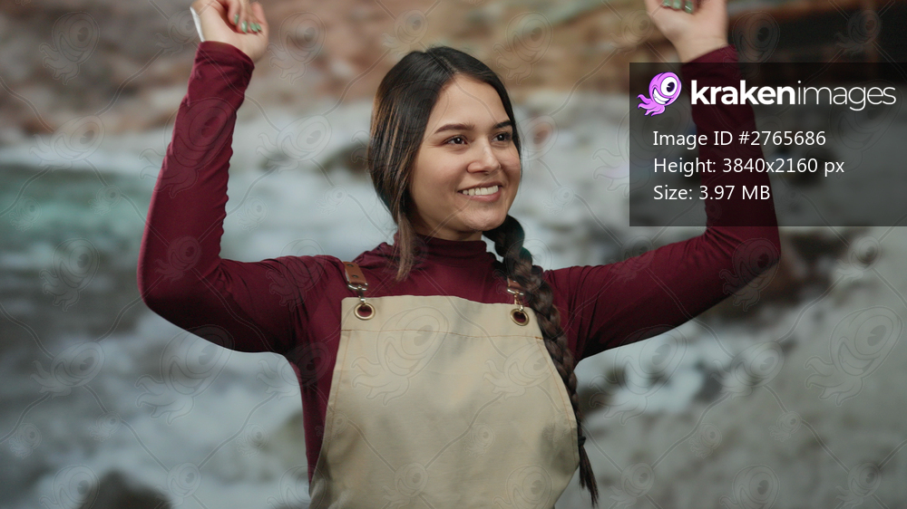 Woman in apron joyfully dancing by the seaside engaging with a lively atmosphere near the beach.
