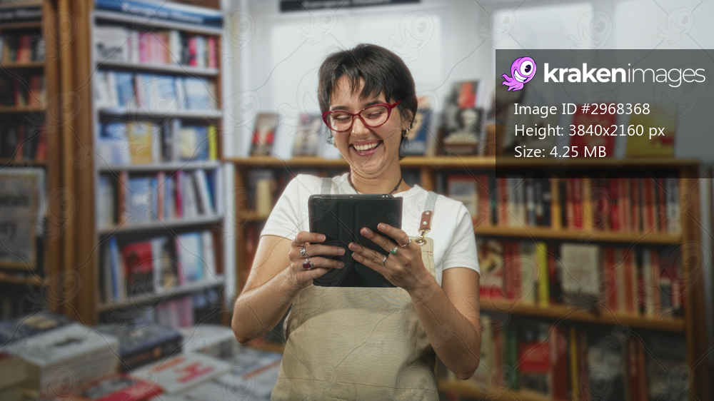 Woman in apron laughs while holding a tablet with both hands in an indie bookstore, wearing red glasses and short hair; friendly joy.