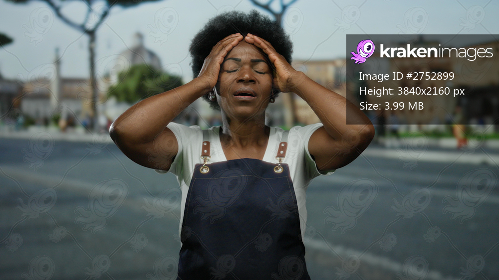 Woman in apron outdoors holding head in frustration on a city street, expressing stress against urban backdrop with blurred buildings and trees.