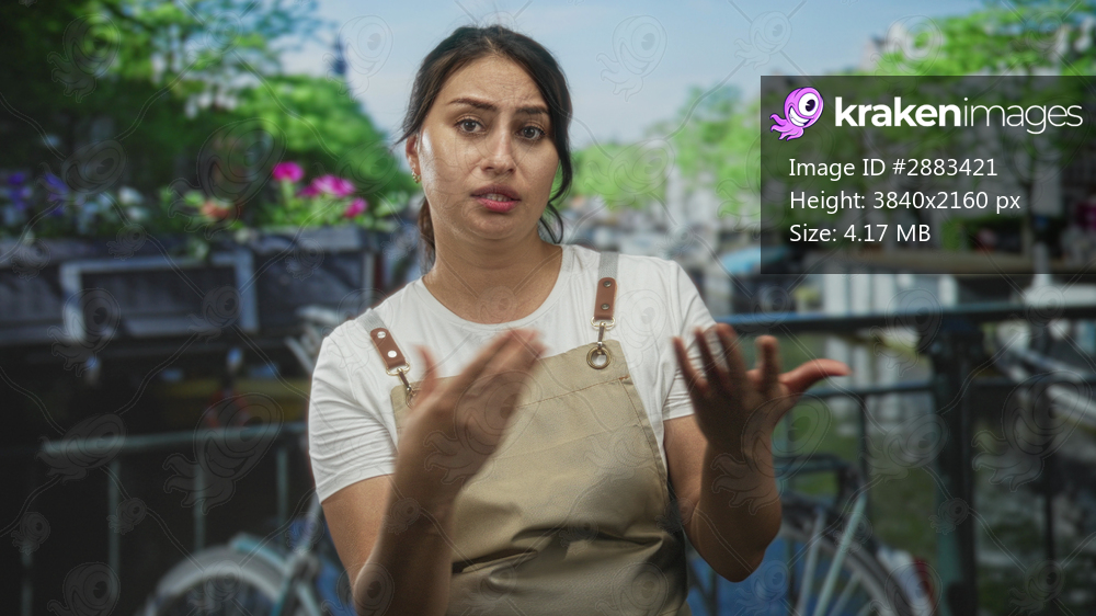 Woman in apron with palms up gesturing and shrugging on an amsterdam street by a canal and bicycle; frustration.