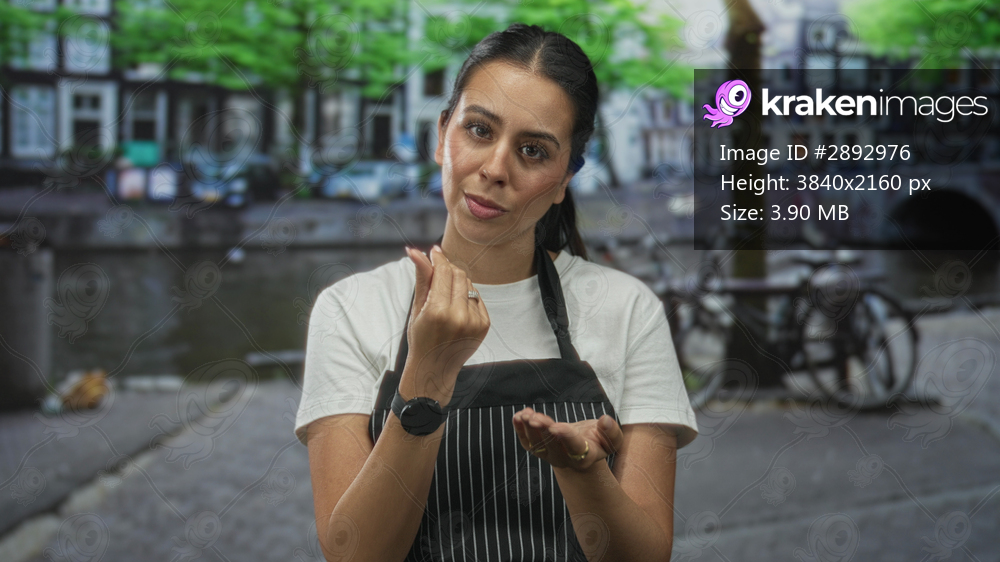 Woman in apron pinches fingers to palm on street by canal and building, showing hands and gesture; confidence teaching.