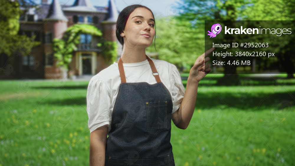 Woman in apron pointing with index finger and smiling in front of a building on a green lawn; confidence warmth.