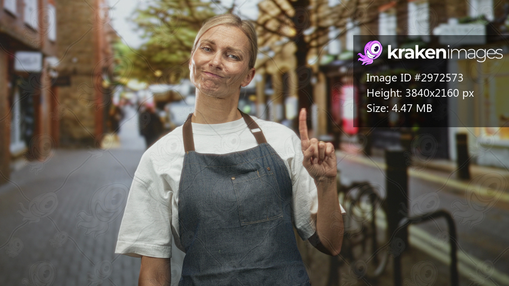 Woman in apron points finger at a shop window on street, wearing denim apron and tshirt; friendly service confidence.