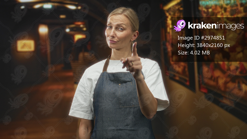 Woman in apron points finger forward inside a dim building corridor lined with paintings and framed displays; confidence authority guidance.