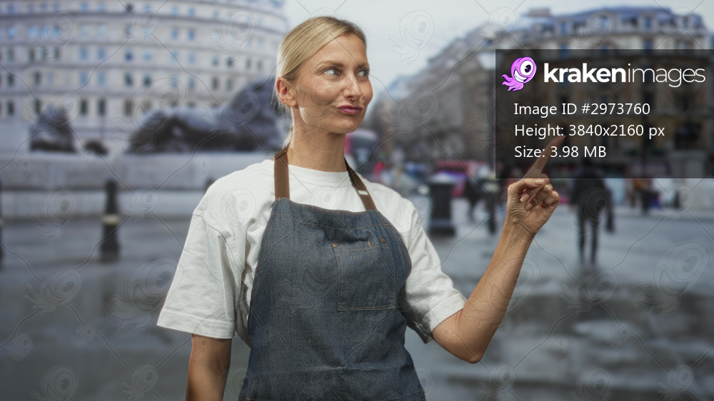 Woman in apron points index finger on a wet city street, wearing denim apron and white tee, looking sideways with a confident smirk and raised hand gesture; practical confidence. - Kraken Images