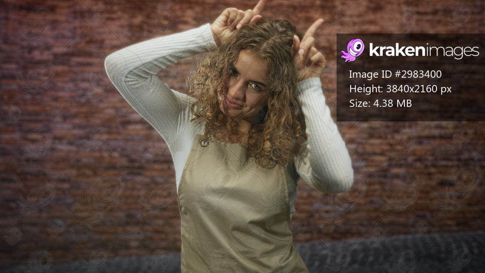 Woman in apron poses with fingers as horns to her head against a studio brick wall; playful confidence.