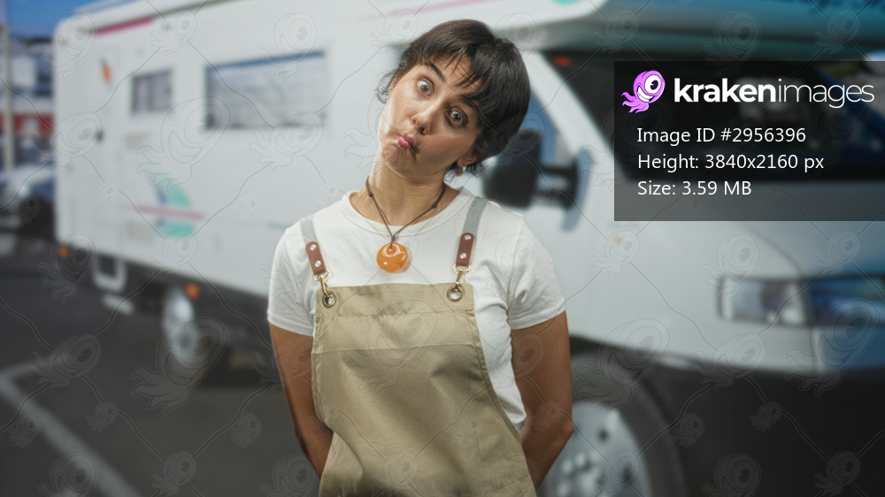 Woman in apron puckers lips and tilts head beside a white parked motorhome on a sunny street; playful curiosity.