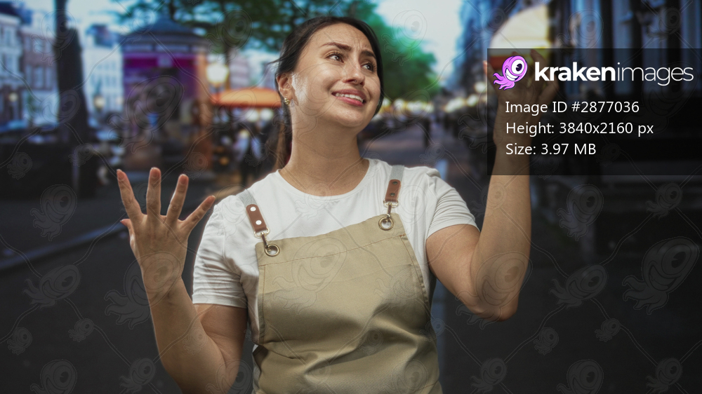 Woman in apron raises hands and gestures palms outward on street with apron straps visible and white tshirt; frustration shift service.