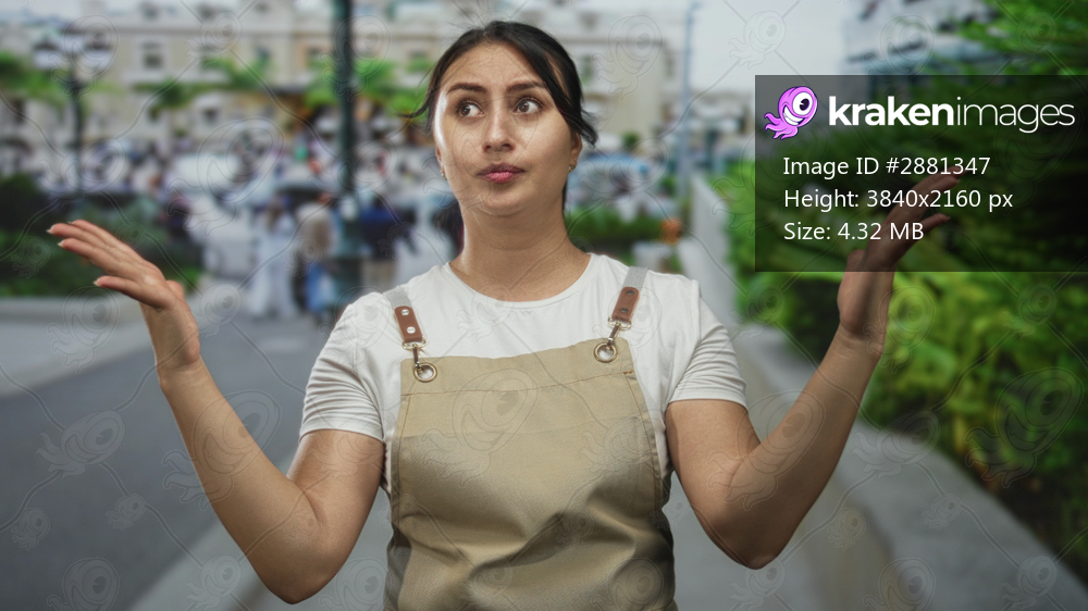 Woman in apron raises hands in a questioning gesture on a busy city street; frustration seeking help.