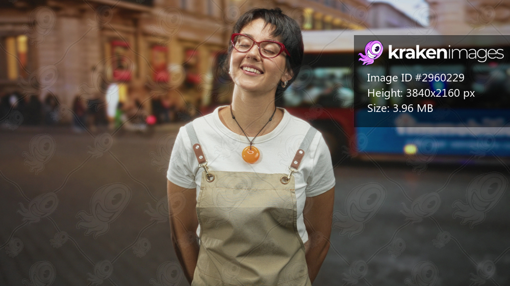 Woman in apron and red glasses smiles with eyes closed, head tilted back, hands behind her back, orange pendant visible on a busy city street; contentment respite. - Kraken Images