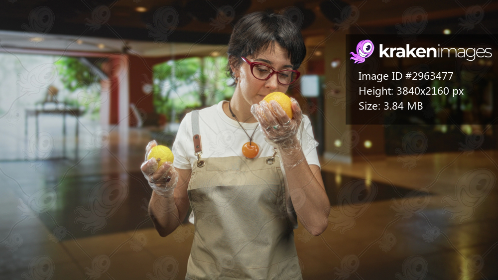 Woman in apron and red glasses sniffs an orange while holding a lemon with gloved hands inside a building lobby with visible plants; calm contentment.