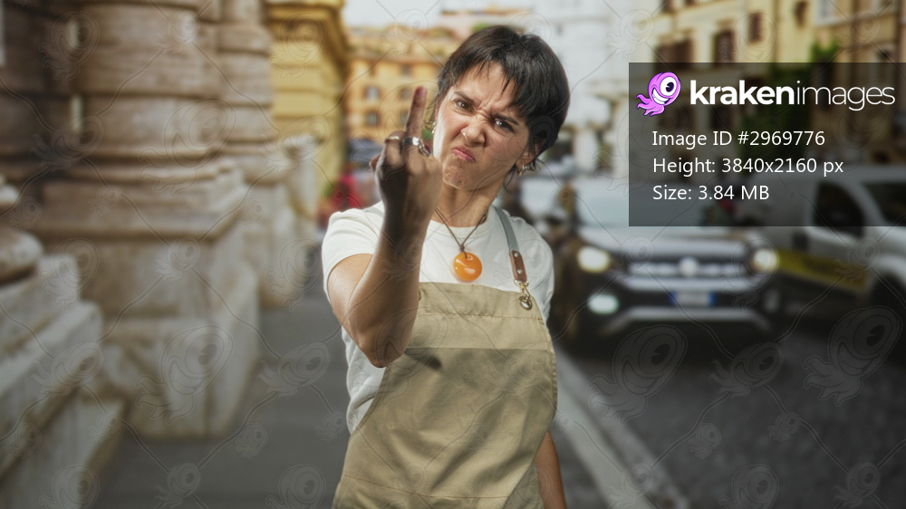 Woman in apron shows middle finger and scowls on a cobbled street near parked cars and stone building facades; defiance confrontation.