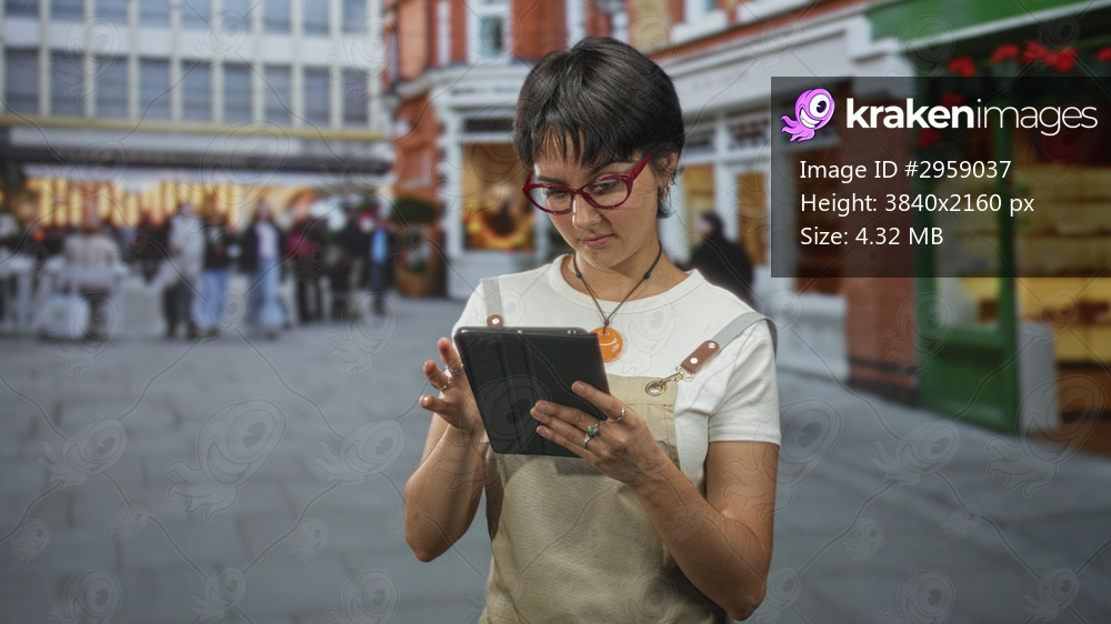 Woman in apron taps tablet with finger on busy shopping street, wearing red glasses and short hair while checking a screen; focused concentration.