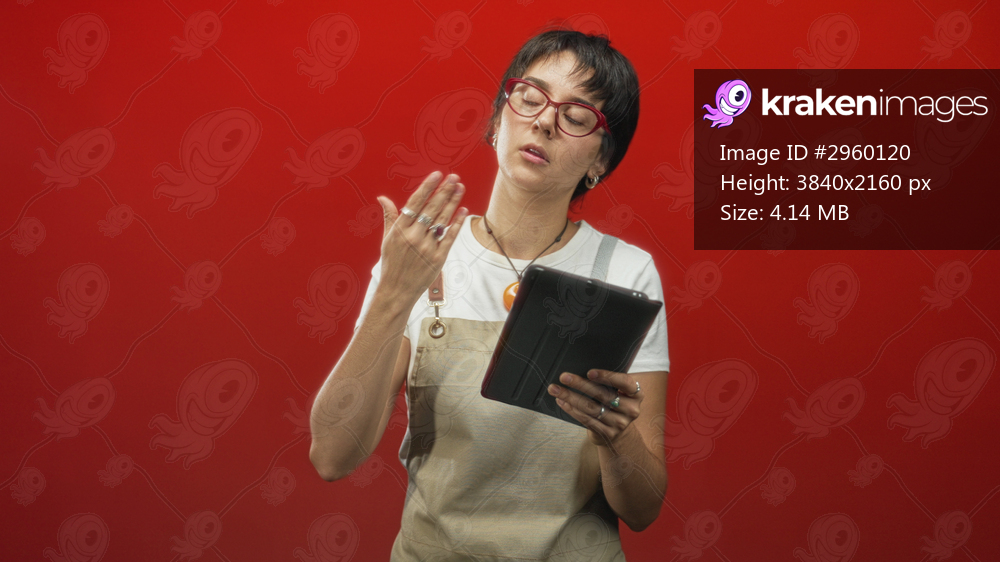 Woman in apron touches her chest with hand while reading a tablet and adjusting glasses in studio; concentration study.