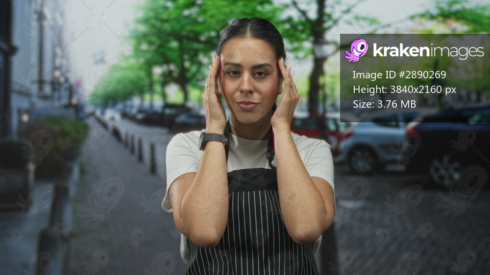 Woman in apron touches her temple with one hand on a street lined with parked cars and trees; serenity.