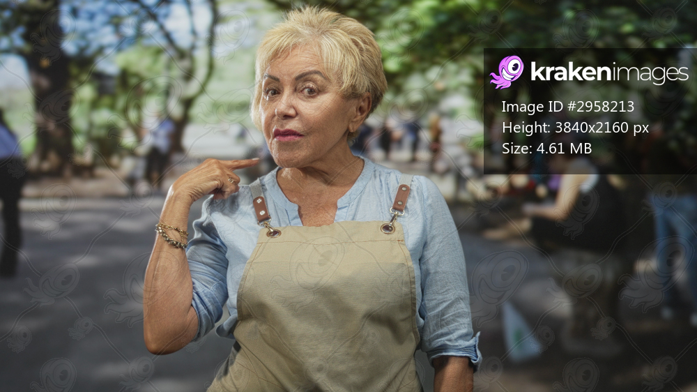 Woman in apron touching lips with finger and pointing toward camera on a street in a park, wearing bracelet and ring; hush mischief.