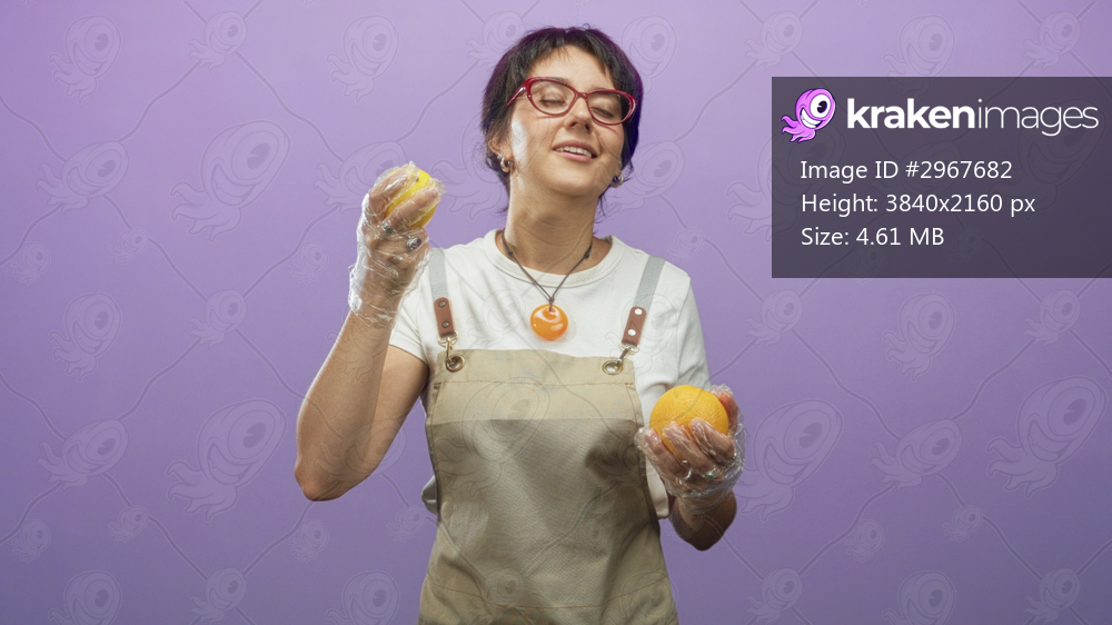 Woman in apron wearing gloves sniffs an orange while holding another orange in a purple studio; sensory delight.