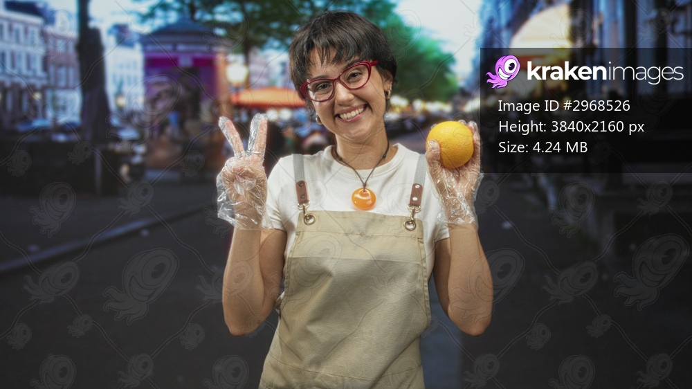 Woman in apron wearing plastic gloves holds an orange and flashes a peace sign on a busy street with blurred cafes and lights; friendly joy.