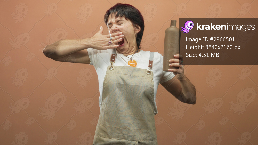 Woman in apron yawns covering mouth with hand while holding ceramic bottle in studio; tiredness artisan.