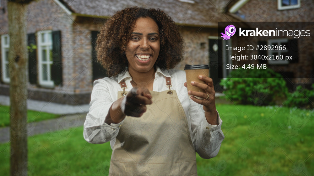 Woman in beige apron points finger while holding a takeaway coffee cup with right hand at building entrance near house lawn; home welcome joy.