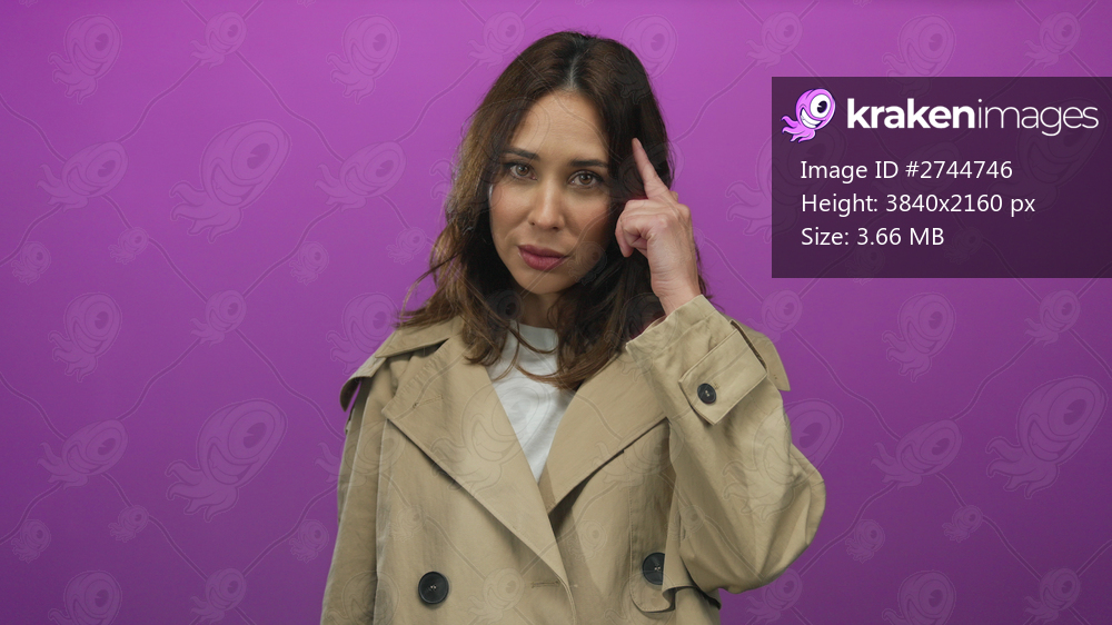 Woman in beige coat gestures thoughtfully against isolated pink background conveying focus and clarity using simple expression and direct gaze
