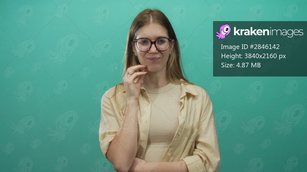 Woman in beige shirt with rolled sleeves and glasses with hand on chin for pondering in studio; quiet contemplation.