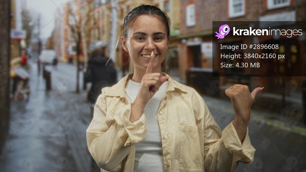 Woman in beige shirt with thumb pointed over shoulder on a wet city street, casual stance and direct gaze; confidence independence.