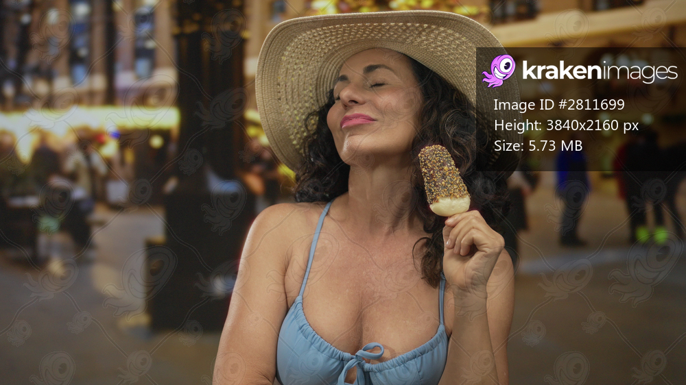 Woman in bikini enjoying ice cream in a lively outdoor night street, wearing a sunhat and smiling confidently amid a bustling crowd and bright lights.