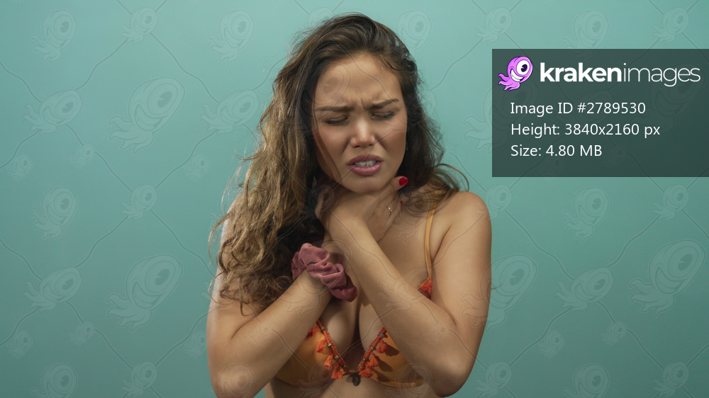 Woman in bikini holding neck against green background, expressing discomfort with hispanic appearance and young features.