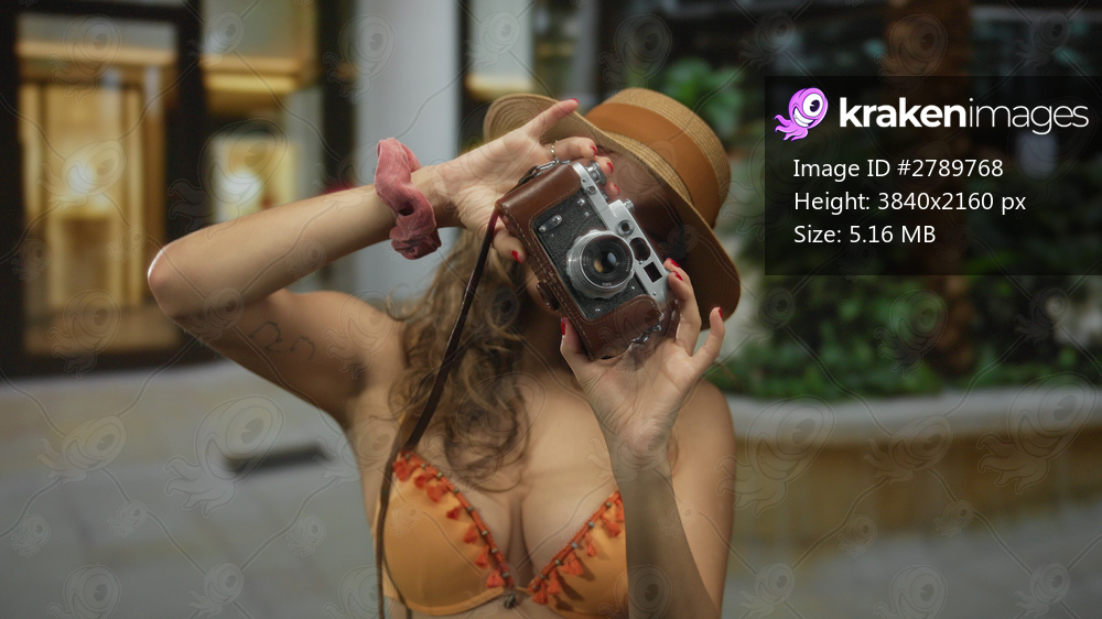 Woman in bikini takes photo with vintage camera on city street, smiling under a sun hat, capturing moment in outdoor urban setting, surrounded by greenery and architecture. - Kraken Images