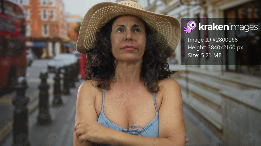 Woman in bikini with thinking pose and straw hat stands on urban street resembling london, surrounded by red buses and historical architecture.
