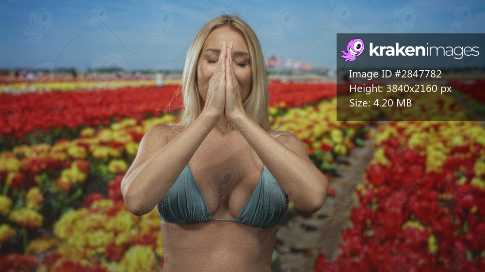 Woman in bikini top presses palms together over exposed chest amid tulip flowers in forest; serenity.