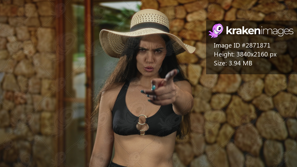 Woman in black bikini top and wide brim hat points finger forward at house entrance; anger defiance.