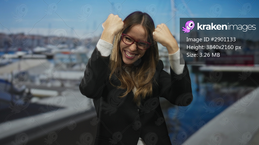 Woman in black blazer flexes arms and raises fists smiling at a marina building with boats and pier; confidence.