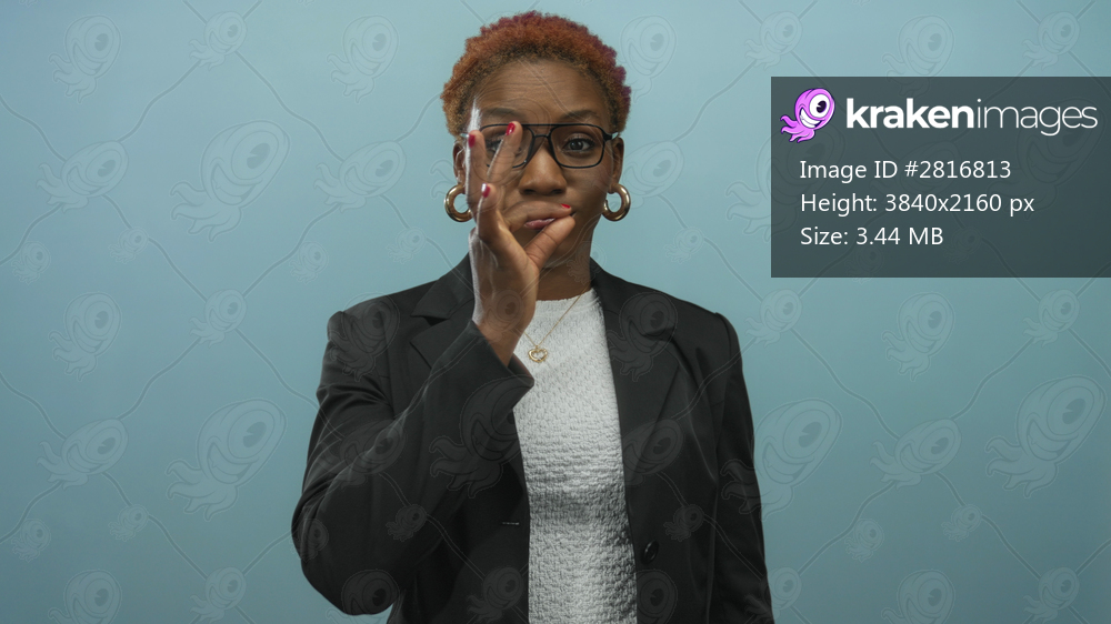 Woman in black blazer places finger to lips in bright blue studio background, emphasizing a sealed lip gesture with thoughtful expression; silence hush. - Kraken Images