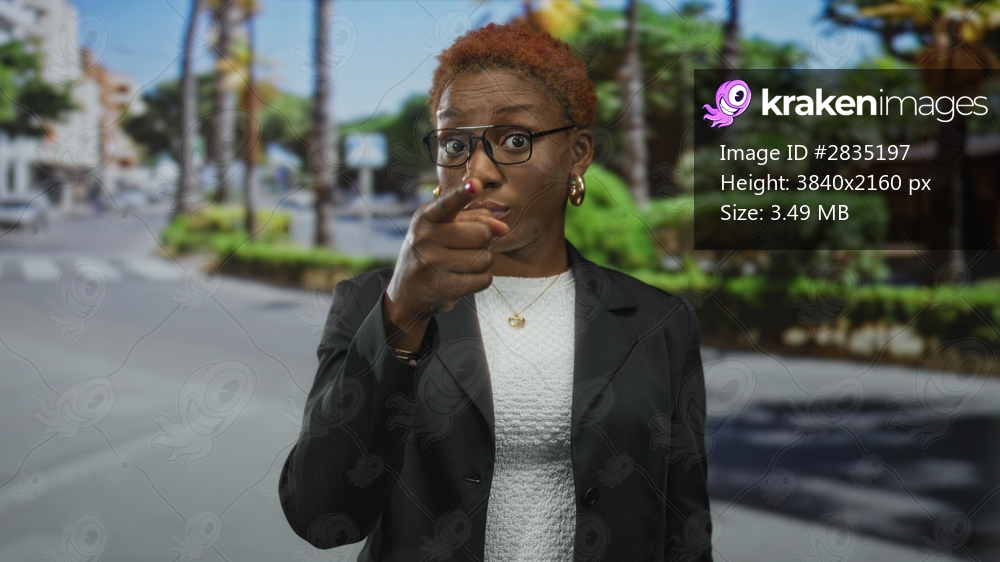 Woman in black blazer pointing finger to temple on urban street with blurred palm trees in background; thoughtful reflection.
