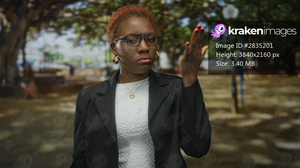 Woman in black blazer and white top holds hand to forehead under dense leafy trees in park; exhaustion.