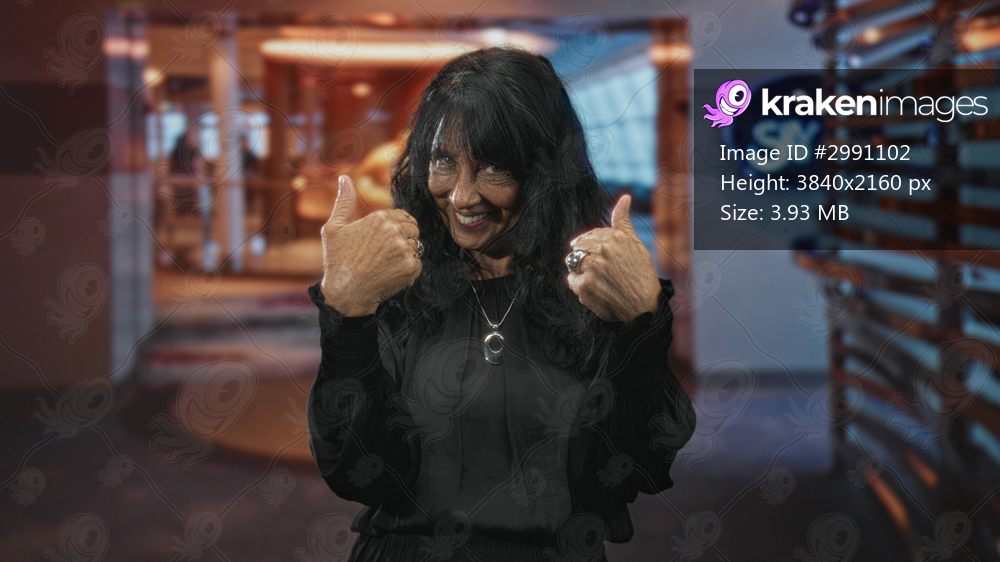 Woman in black blouse giving double thumbs up, smiling broadly with pendant and rings visible in an airport lounge interior; optimism celebration.