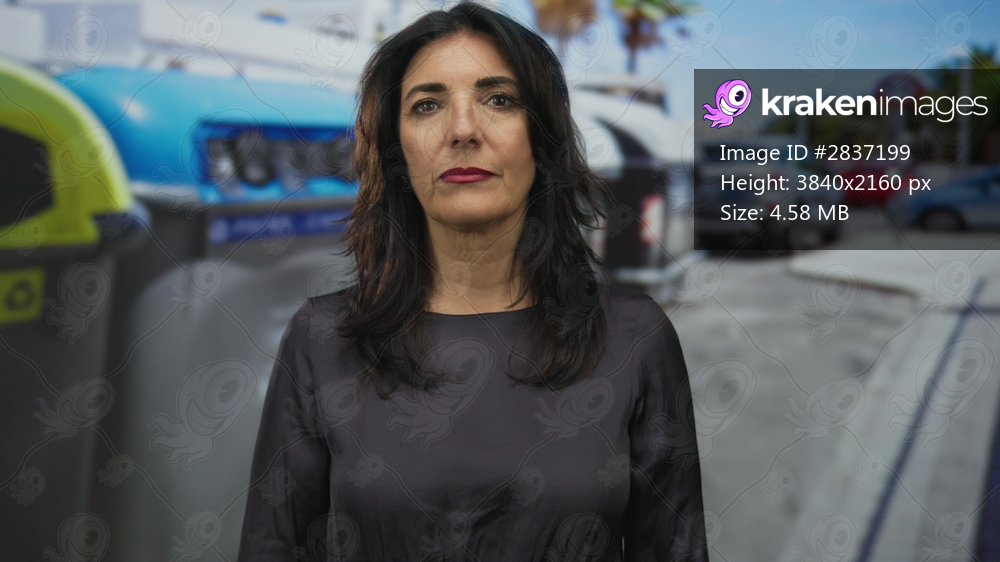 Woman in black blouse stands before a recycling container on street looking at camera; environmental awareness.